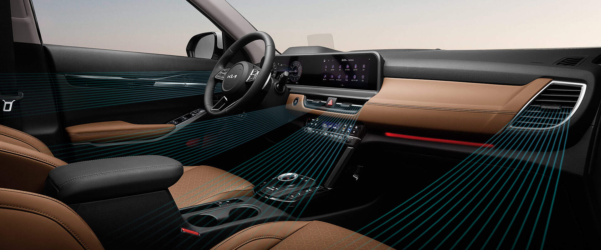 가장 눈에 띄는 변화는 27인치 와이드 디스플레이입니다. 계기판과 인포테인먼트 시스템이 하나로 연결된 파노라믹 디스플레이와 5인치 공조 디스플레이가 어우러져, 한층 넓어진 공간감과 직관적인 UI를 제공합니다. 스티어링 휠 디자인도 EV3 스타일을 따랐으며, 우측으로 치우친 신형 기아 로고는 프리미엄 감성을 살려줍니다.